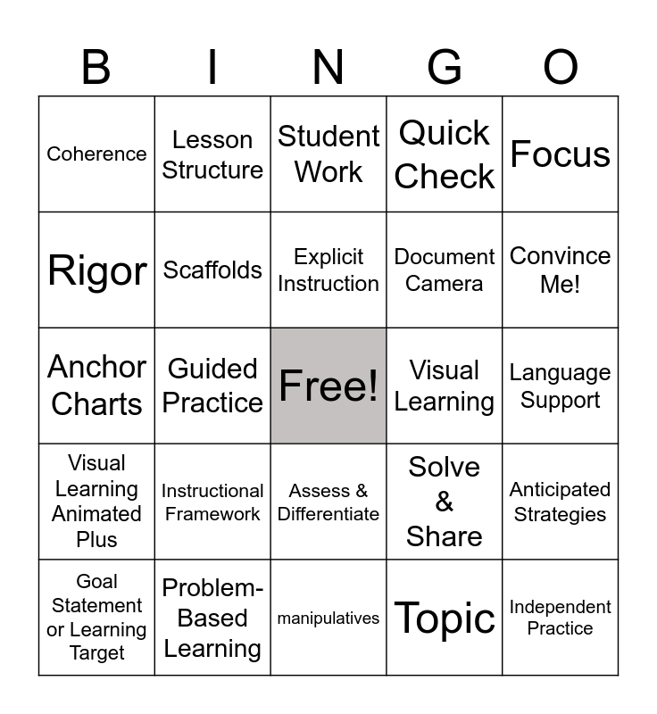 This bingo card has a free space and 24 words: Instructional Framework, Problem-Based Learning, Explicit Instruction, Goal Statement or Learning Target, Focus, Coherence, Rigor, Lesson Structure, Visual Learning, Assess & Differentiate, Document Camera, Anchor Charts, Solve & Share, Anticipated Strategies, Scaffolds, Topic, Language Support, Student Work, Convince Me!, Guided Practice, Independent Practice, Visual Learning Animated Plus, Quick Check and manipulatives.
