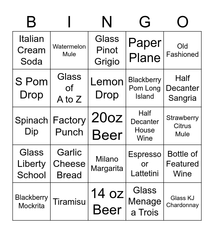 This bingo card has a free space and 24 words: Garlic Cheese Bread, Tiramisu, Lemon Drop, Blackberry Mockrita, Old Fashioned, Italian Cream Soda, S Pom Drop, Watermelon Mule, Half Decanter House Wine, Milano Margarita, Blackberry Pom Long Island, Spinach Dip, Espresso or Lattetini, Bottle of Featured Wine, Glass of A to Z, Glass Menage a Trois, Strawberry Citrus Mule, Glass Pinot Grigio, Half Decanter Sangria, Factory Punch, Glass KJ Chardonnay, Glass Liberty School, Paper Plane and 14 oz Beer.