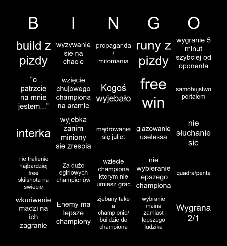 This bingo card has a free space and 24 words: Za dużo egirlowych championów, Enemy ma lepsze championy, Kogoś wyjebało, wkuriwenie madzi na ich zagranie, wygranie 5 minut szybciej od oponenta, build z pizdy, "o patrzcie na mnie jestem...", wyzywanie sie na chacie, glazowanie uselessa, wziecie championa ktorym nie umiesz grac, free win, interka, nie wybieranie lepszego championa, quadra/penta, wzięcie chujowego championa na aramie, wybranie maina zamiast lepszego ludzika, nie słuchanie sie, propaganda / mitomania, samobujstwo portalem, wyjebka zanim miniony sie zrespia, Wygrana 2/1, nie trafienie najbardziej free skilshota na swiecie, runy z pizdy and zjebany take a championie/ buildzie do championa.