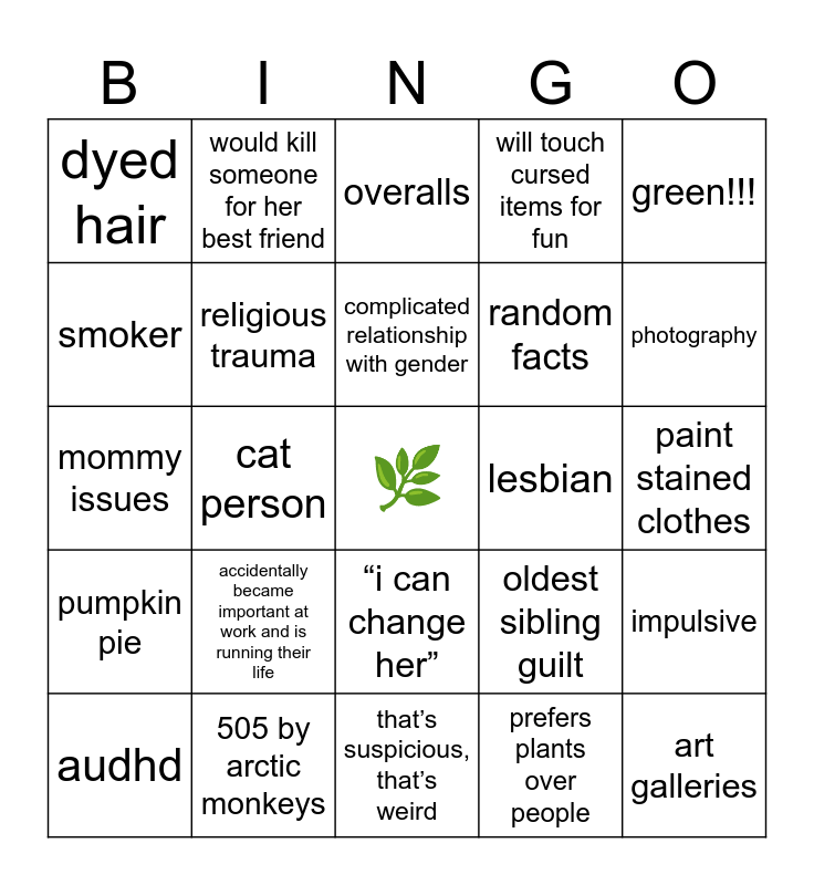 This bingo card has a free space and 24 words: audhd, accidentally became important at work and is running their life, complicated relationship with gender, prefers plants over people, green!!!, dyed hair, would kill someone for her best friend, overalls, lesbian, paint stained clothes, mommy issues, religious trauma, oldest sibling guilt, impulsive, smoker, 505 by arctic monkeys, that’s suspicious, that’s weird, will touch cursed items for fun, photography, pumpkin pie, cat person, “i can change her”, random facts and art galleries.