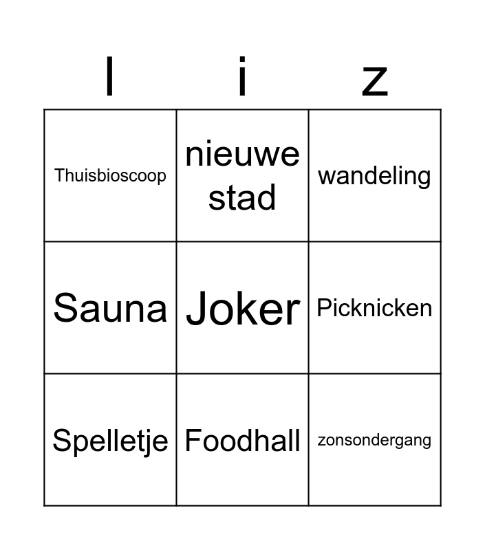 This bingo card has a free space and 8 words: Picknicken, wandeling, nieuwe stad, Spelletje, Thuisbioscoop, zonsondergang, Sauna and Foodhall.