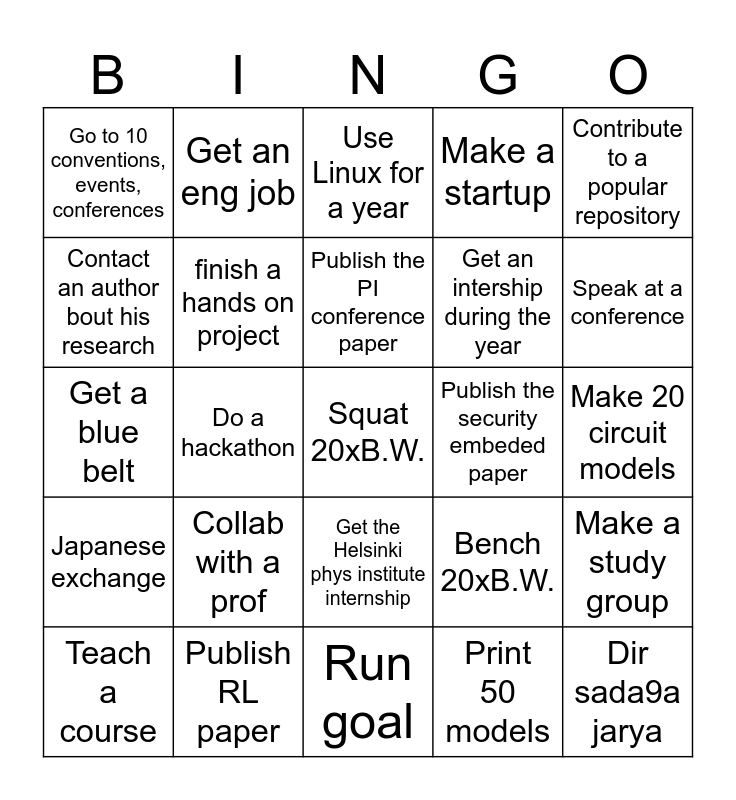 This bingo card has a free space and 24 words: Collab with a prof, Publish RL paper, Publish the PI conference paper, Teach a course, Contribute to a popular repository, Go to 10 conventions, events, conferences, Contact an author bout his research, Get an eng job, Publish the security embeded paper, Get the Helsinki phys institute internship, Get an intership during the year, Get a blue belt, Bench 20xB.W., Make a study group, finish a hands on project, Print 50 models, Make 20 circuit models, Use Linux for a year, Speak at a conference, Do a hackathon, Dir sada9a jarya, Japanese exchange, Make a startup and Run goal.