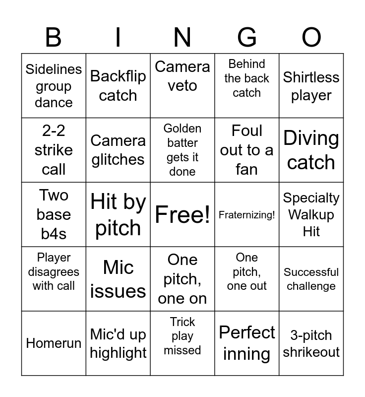 This bingo card has a free space and 26 words: One pitch, one on, Perfect inning, Golden batter gets it done, Mic'd up highlight, Shirtless player, Sidelines group dance, 2-2 strike call, Backflip catch, Specialty Walkup Hit, One pitch, one out, Foul out to a fan, Two base b4s, Successful challenge, Homerun, Hit by pitch, Stolen base, Behind the back catch, Player disagrees with call, Camera veto, 3-pitch shrikeout, Diving catch, Trick play missed, Fraternizing!, Mic issues, Camera glitches and Steal of first.
