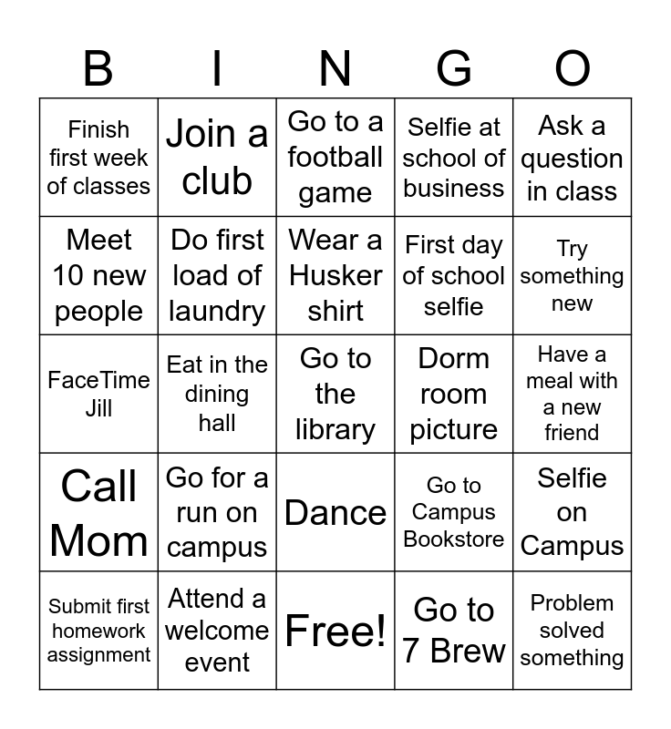 This bingo card has 25 words: Call Mom, Attend a welcome event, Go to the library, Go to 7 Brew, Ask a question in class, Finish first week of classes, Join a club, Go to a football game, Dorm room picture, Selfie on Campus, Meet 10 new people, Do first load of laundry, Free!, Go to Campus Bookstore, Try something new, Submit first homework assignment, Eat in the dining hall, Wear a Husker shirt, First day of school selfie, Have a meal with a new friend, FaceTime Jill, Go for a run on campus, Dance, Selfie at school of business and Problem solved something.