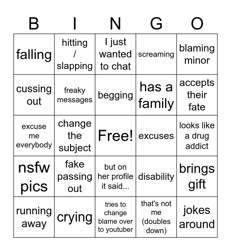 This bingo card has a free space and 24 words: fake passing out, crying, begging, running away, blaming minor, falling, cussing out, hitting / slapping, excuses, but on her profile it said..., has a family, excuse me everybody, disability, brings gift, freaky messages, that's not me (doubles down), looks like a drug addict, I just wanted to chat, accepts their fate, change the subject, jokes around, nsfw pics, screaming and tries to change blame over to youtuber.
