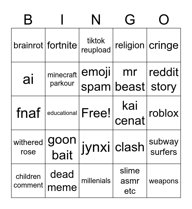 This bingo card has a free space and 24 words: goon bait, dead meme, emoji spam, children comment, cringe, brainrot, ai, fortnite, kai cenat, jynxi, mr beast, fnaf, clash, subway surfers, minecraft parkour, slime asmr etc, roblox, tiktok reupload, reddit story, educational, weapons, withered rose, religion and millenials.