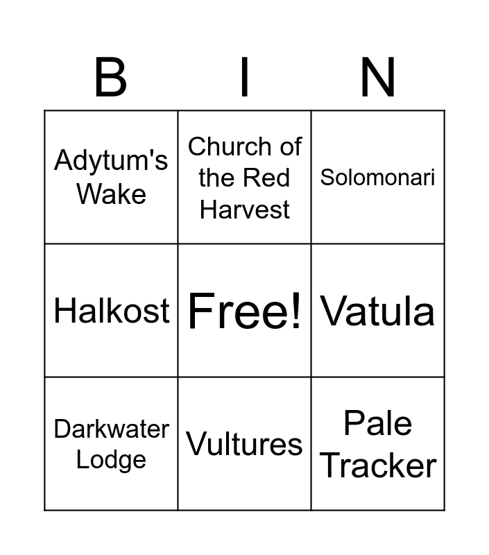 This bingo card has a free space and 8 words: Vatula, Solomonari, Church of the Red Harvest, Darkwater Lodge, Adytum's Wake, Pale Tracker, Halkost and Vultures.