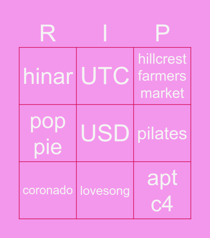 This bingo card has 15 words: la jolla, matcha, hillcrest farmers market, hinar, lovesong, USD, parallel parking, balboa park, pilates, apt c4, coco curry, pop pie, coronado, UTC and an's gelato.