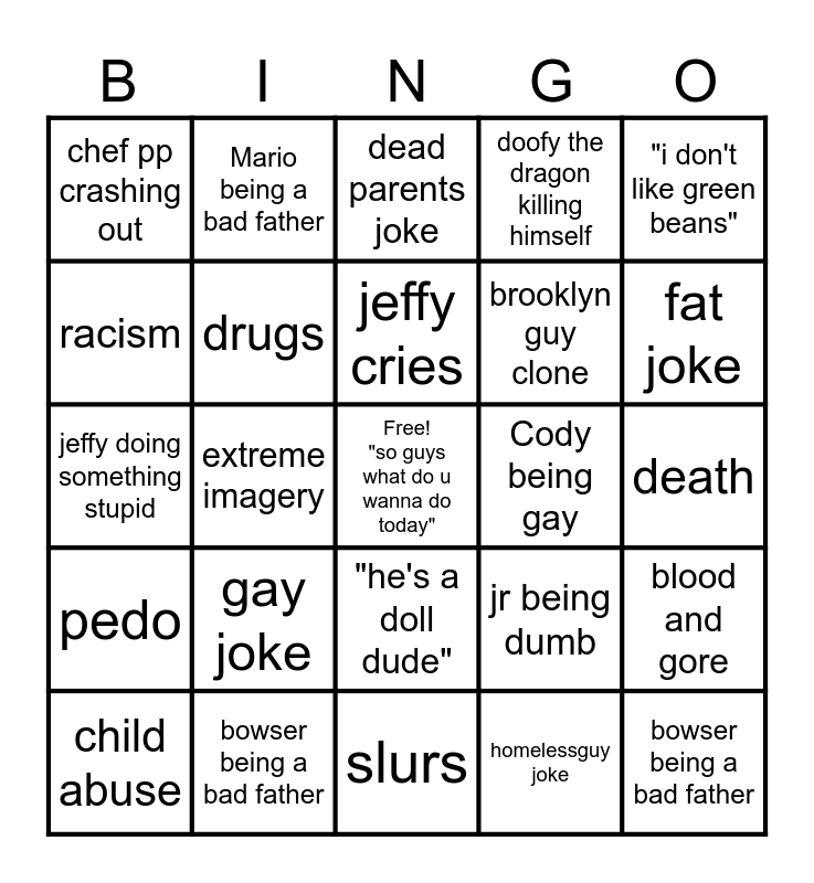 This bingo card has a free space and 24 words: gay joke, bowser being a bad father, jeffy cries, child abuse, "i don't like green beans", chef pp crashing out, racism, Mario being a bad father, Cody being gay, "he's a doll dude", brooklyn guy clone, jeffy doing something stupid, jr being dumb, blood and gore, drugs, homelessguy joke, death, dead parents joke, fat joke, extreme imagery, bowser being a bad father, pedo, doofy the dragon killing himself and slurs.