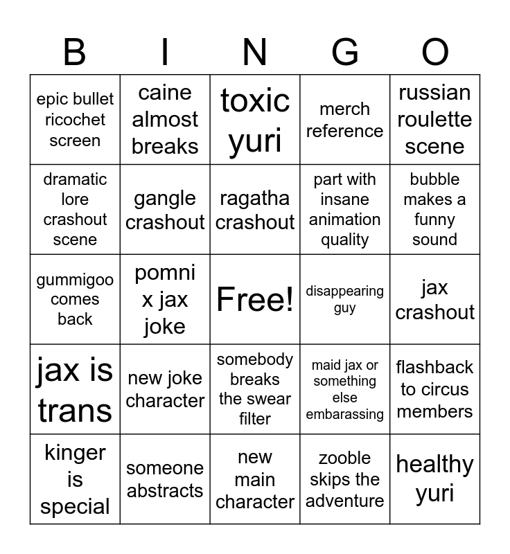 This bingo card has a free space and 24 words: new joke character, someone abstracts, ragatha crashout, kinger is special, russian roulette scene, epic bullet ricochet screen, dramatic lore crashout scene, caine almost breaks, disappearing guy, somebody breaks the swear filter, part with insane animation quality, gummigoo comes back, maid jax or something else embarassing, flashback to circus members, gangle crashout, zooble skips the adventure, jax crashout, toxic yuri, bubble makes a funny sound, pomni x jax joke, healthy yuri, jax is trans, merch reference and new main character.