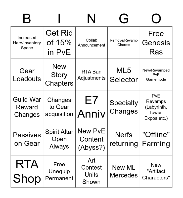 This bingo card has a free space and 24 words: Spirit Altar Open Always, Free Unequip Permanent, RTA Ban Adjustments, RTA Shop, Free Genesis Ras, Increased Hero/Inventory Space, Gear Loadouts, Get Rid of 15% in PvE, Specialty Changes, New PvE Content (Abyss?), ML5 Selector, Guild War Reward Changes, Nerfs returning, "Offline" Farming, New Story Chapters, New ML Mercedes, PvE Revamps (Labyrinth, Tower, Expos etc.), Collab Announcement, New/Revamped PvP Gamemode, Changes to Gear acquisition, New "Artifact Characters", Passives on Gear, Remove/Revamp Charms and Art Contest Units Shown.