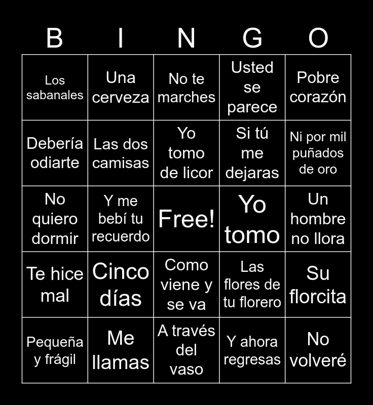 This bingo card has a free space and 49 words: Charros para rato, No volveré, Morena de mis amores, A través del vaso, Cinco días, Furia loca, Una cerveza, Que te vaya bien, Debería odiarte, Cinco minutos y nada más, Las dos camisas, Usted se parece, Su florcita, Las flores de tu florero, Por que te tengo que olvidar?, Agua que no es de beber, Yo tomo de licor, Yo tomo, Simpática y muy bonita, Pobre corazón, Y me bebí tu recuerdo, Y ahora regresas, Los sabanales, Si tú me dejaras, Al ritmo del tigre, Ni por mil puñados de oro, Pequeña y frágil, Entre golpes y besos, Como viene y se va, Te hice mal, Contigo, Nunca es suficiente, Perdonarte, para que?, Un finde, Me llamas, Los infieles, Ahora que te vas, Me embriagaré, Un hombre no llora, Ando de borracha re, Romance ilegal, Gua gua dice mi perro, Porque me haces llorar, Tenemos sed, No quiero dormir, No te marches, Mentirosa, Condéname and Golpe con golpe.