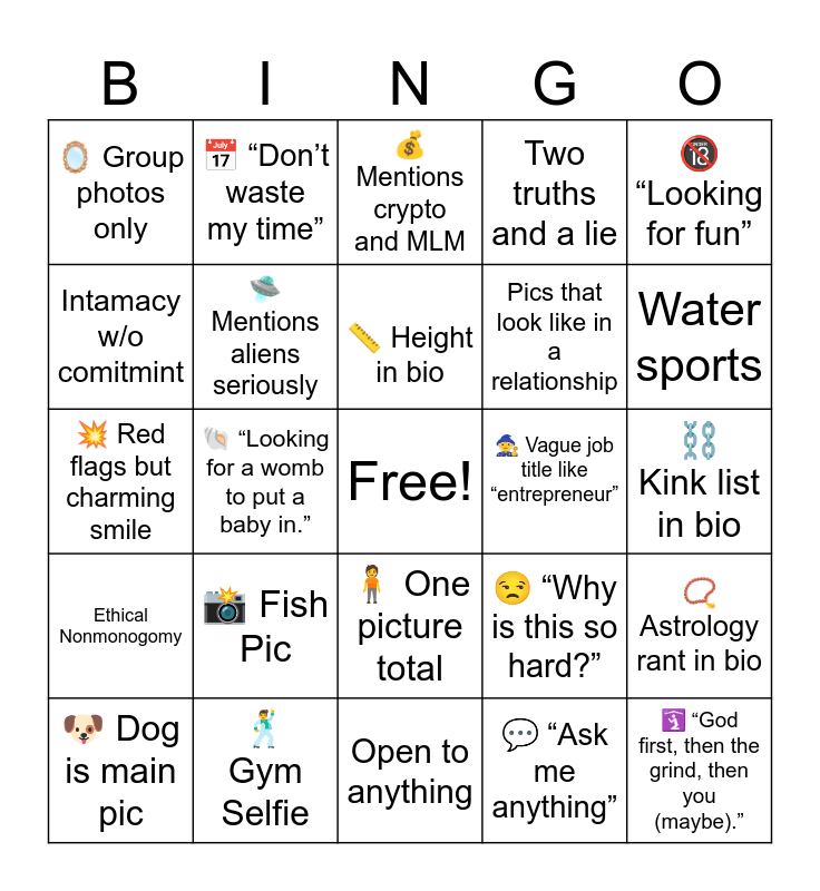 This bingo card has a free space and 24 words: 📸 Fish Pic, 🕺 Gym Selfie, 📏 Height in bio, 🐶 Dog is main pic, 🔞 “Looking for fun”, 🪞 Group photos only, Intamacy w/o comitmint, 📅 “Don’t waste my time”, 🧙 Vague job title like “entrepreneur”, 🧍 One picture total, Pics that look like in a relationship, 💥 Red flags but charming smile, 😒 “Why is this so hard?”, 📿 Astrology rant in bio, 🛸 Mentions aliens seriously, 💬 “Ask me anything”, ⛓️ Kink list in bio, 💰 Mentions crypto and MLM, Water sports, 🐚 “Looking for a womb to put a baby in.”, 🛐 “God first, then the grind, then you (maybe).”, Ethical Nonmonogomy, Two truths and a lie and Open to anything.