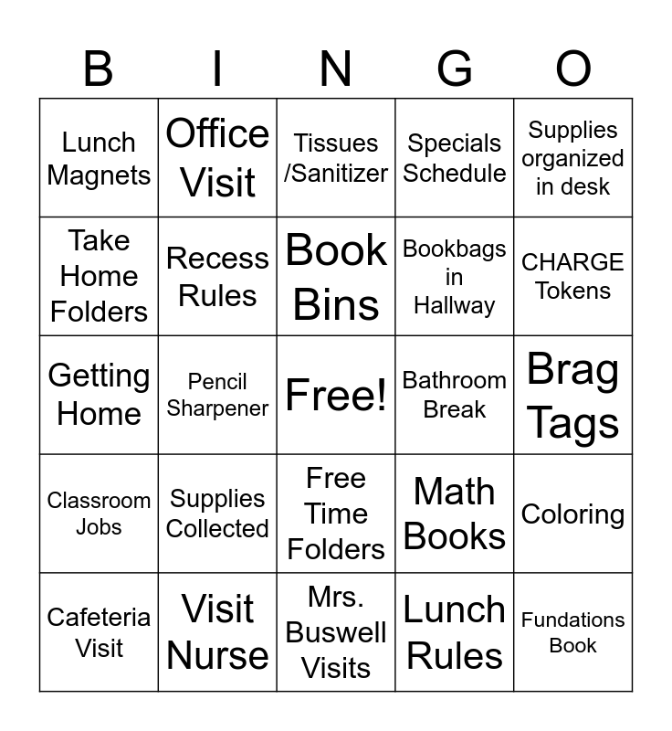 This bingo card has a free space and 24 words: Supplies Collected, Visit Nurse, Book Bins, Cafeteria Visit, Supplies organized in desk, Lunch Magnets, Take Home Folders, Office Visit, Bathroom Break, Free Time Folders, Bookbags in Hallway, Getting Home, Math Books, Coloring, Recess Rules, Lunch Rules, Brag Tags, Tissues /Sanitizer, CHARGE Tokens, Pencil Sharpener, Fundations Book, Classroom Jobs, Specials Schedule and Mrs. Buswell Visits.