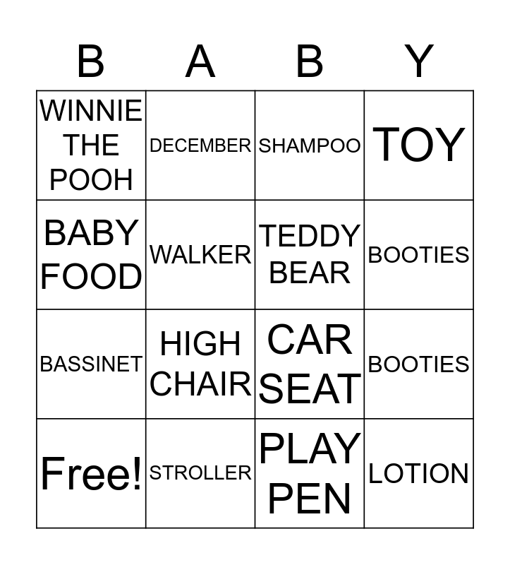 This bingo card has a free space and 15 words: Free!, LOTION, SHAMPOO, WINNIE THE POOH, BOOTIES, BABY FOOD, HIGH CHAIR, PLAY PEN, WALKER, BASSINET, BOOTIES, TOY, TEDDY BEAR, DECEMBER and STROLLER.