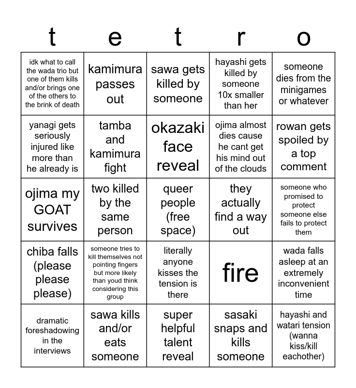 This bingo card has a free space and 24 words: someone tries to kill themselves not pointing fingers but more likely than youd think considering this group, sawa kills and/or eats someone, okazaki face reveal, dramatic foreshadowing in the interviews, someone dies from the minigames or whatever, idk what to call the wada trio but one of them kills and/or brings one of the others to the brink of death, yanagi gets seriously injured like more than he already is, kamimura passes out, they actually find a way out, literally anyone kisses the tension is there, ojima almost dies cause he cant get his mind out of the clouds, ojima my GOAT survives, fire, wada falls asleep at an extremely inconvenient time, tamba and kamimura fight, sasaki snaps and kills someone, someone who promised to protect someone else fails to protect them, sawa gets killed by someone, rowan gets spoiled by a top comment, two killed by the same person, hayashi and watari tension (wanna kiss/kill eachother), chiba falls (please please please), hayashi gets killed by someone 10x smaller than her and super helpful talent reveal.