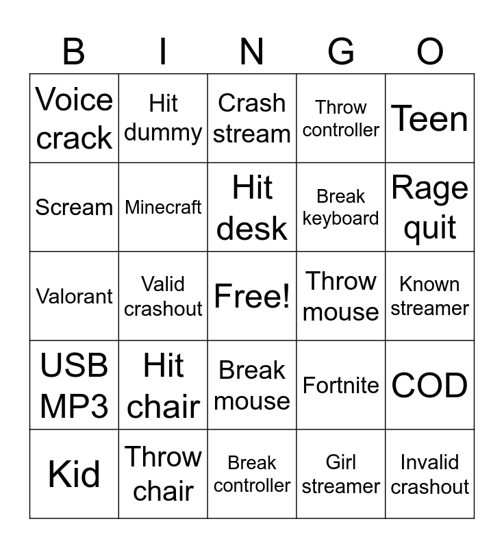 This bingo card has a free space and 24 words: Hit chair, Throw chair, Hit desk, Kid, Teen, Voice crack, Scream, Hit dummy, Throw mouse, Break mouse, Break keyboard, Valorant, Fortnite, COD, Minecraft, Girl streamer, Known streamer, Crash stream, Rage quit, Valid crashout, Invalid crashout, USB MP3, Throw controller and Break controller.