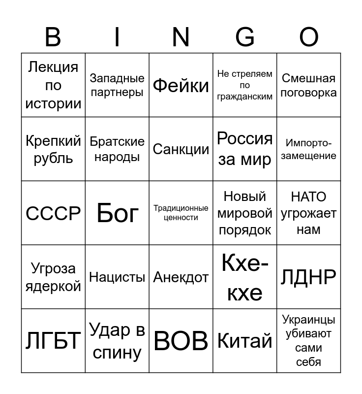 This bingo card has 25 words: Нацисты, ВОВ, Санкции, ЛГБТ, Смешная поговорка, Лекция по истории, Крепкий рубль, Западные партнеры, Новый мировой порядок, Анекдот, Россия за мир, СССР, Кхе-кхе, ЛДНР, Братские народы, Украинцы убивают сами себя, НАТО угрожает нам, Фейки, Импорто-замещение, Бог, Традиционные ценности, Удар в спину, Угроза ядеркой, Не стреляем по гражданским and Китай.