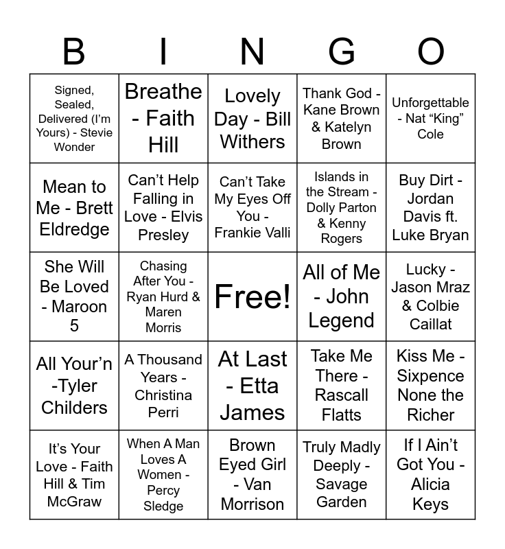 This bingo card has a free space and 41 words: Lover - Taylor Swift, She Will Be Loved - Maroon 5, My Girl - The Temptations, Can’t Help Falling in Love - Elvis Presley, When A Man Loves A Women - Percy Sledge, At Last - Etta James, Can’t Take My Eyes Off You - Frankie Valli, Save the Last Dance for Me - The Drifters, Unforgettable - Nat “King” Cole, All Your’n -Tyler Childers, Chasing After You - Ryan Hurd & Maren Morris, Thank God - Kane Brown & Katelyn Brown, If I Ain’t Got You - Alicia Keys, Lucky - Jason Mraz & Colbie Caillat, All of Me - John Legend, A Thousand Years - Christina Perri, You’re Still the One - Shania Twain, Signed, Sealed, Delivered (I’m Yours) - Stevie Wonder, You Make My Dreams (Come True) - Daryl Hall & John Oates, Lovely Day - Bill Withers, Kiss Me - Sixpence None the Richer, (I’ve Had) The Time of My Life - Bill Medley & Jennifer Warnes, Brown Eyed Girl - Van Morrison, Islands in the Stream - Dolly Parton & Kenny Rogers, Forever and Ever, Amen - Randy Travis, Iris - The Goo Goo Dolls, Truly Madly Deeply - Savage Garden, Be Without You - Mary J. Blige, Buy Dirt - Jordan Davis ft. Luke Bryan, Beautiful Crazy - Luke Combs, Die A Happy Man - Thomas Rhett, Breathe - Faith Hill, It’s Your Love - Faith Hill & Tim McGraw, Cover Me Up - Jason Isbell, Take Me There - Rascall Flatts, Mean to Me - Brett Eldredge, God Gave me You - Blake Shelton, Speechless - Dan + Shay, Tennessee Whiskey - Chris Stapleton, I Cross My Heart - George Straight and Flesh and Blood - Johnny Cash.