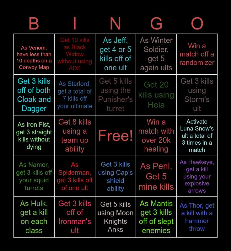 This bingo card has a free space and 24 words: As Spiderman, get 3 kills off of one ult, Get 3 kills off of Ironman's ult, Get 5 kills using the Punisher's turret, As Hulk, get a kill on each class, Win a match off a randomizer, As Venom, have less than 10 deaths on a Convoy Map, Get 3 kills off of both Cloak and Dagger, Get 10 kills as Black Widow without using ADS, Win a match with over 20k healing, Get 3 kills using Cap's shield ability, Get 20 kills using Hela, As Iron Fist, get 3 straight kills without dying, As Peni, Get 5 mine kills, As Hawkeye, get a kill using your explosive arrows, As Starlord, get a total of 7 kills off your ultimate, As Mantis get 3 kills off of slept enemies, Activate Luna Snow's ult a total of 3 times in a match, As Jeff, get 4 or 5 kills off of one ult, Get 3 kills using Storm's ult, Get 8 kills using a team up ability, As Thor, get a kill with a hammer throw, As Namor, get 3 kills off your squid turrets, As Winter Soldier, get 5 again ults and Get 5 kills using Moon Knights Anks.