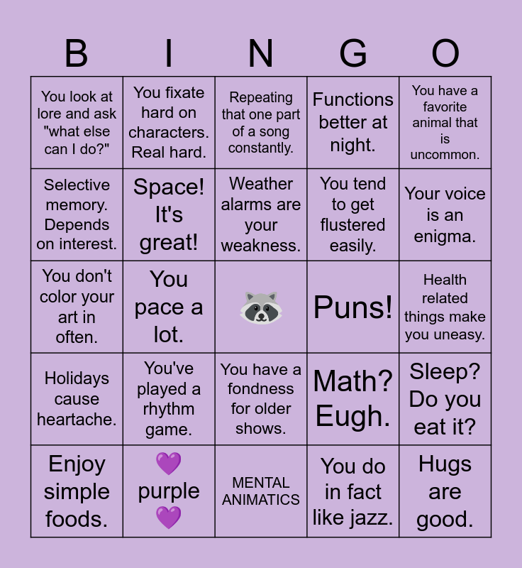 This bingo card has a free space and 24 words: You've played a rhythm game., 💜purple 💜, Weather alarms are your weakness., Enjoy simple foods., You have a favorite animal that is uncommon., You look at lore and ask "what else can I do?", Selective memory. Depends on interest., You fixate hard on characters. Real hard., Puns!, You have a fondness for older shows., You tend to get flustered easily., You don't color your art in often., Math? Eugh., Sleep? Do you eat it?, Space! It's great!, You do in fact like jazz., Health related things make you uneasy., Repeating that one part of a song constantly., Your voice is an enigma., You pace a lot., Hugs are good., Holidays cause heartache., Functions better at night. and MENTAL ANIMATICS.