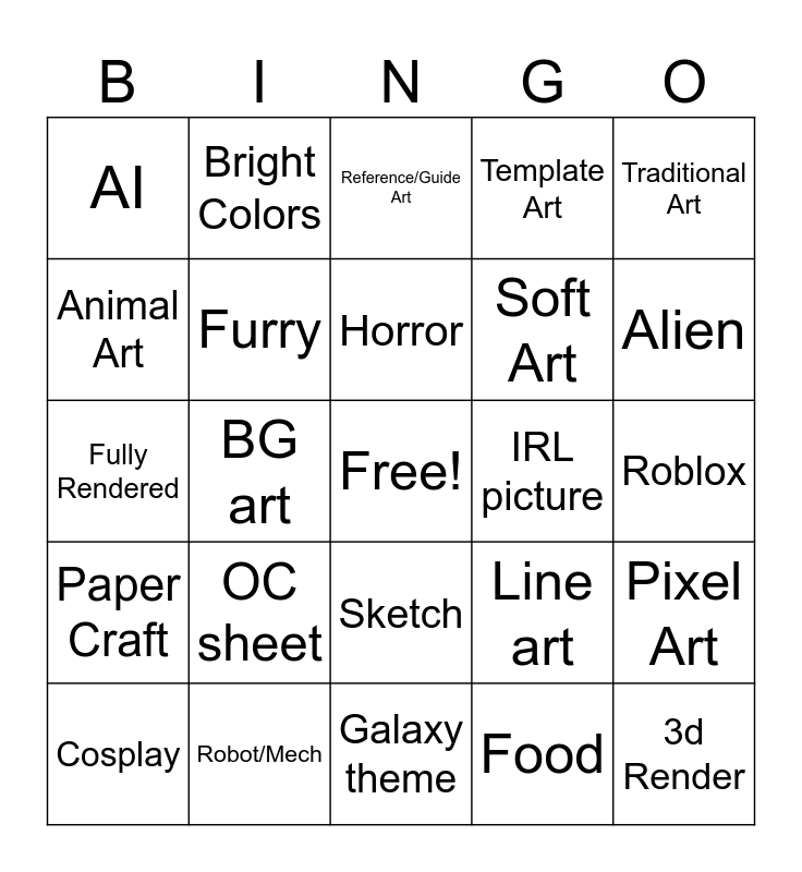 This bingo card has a free space and 24 words: Cosplay, OC sheet, Horror, Food, Traditional Art, AI, Bright Colors, Reference/Guide Art, IRL picture, Roblox, Fully Rendered, Furry, Line art, Pixel Art, Animal Art, Robot/Mech, Galaxy theme, Template Art, Alien, Paper Craft, BG art, Sketch, Soft Art and 3d Render.
