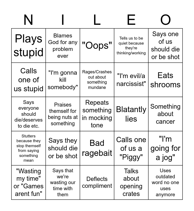 This bingo card has a free space and 24 words: Says they should die or be shot, Says that we're wasting our time with them, Rages/Crashes out about something mundane, "Wasting my time" or "Games arent fun", Says one of us should die or be shot, Plays stupid, Calls one of us stupid, Blames God for any problem ever, Blatantly lies, Bad ragebait, "I'm evil/a narcissist", Says everyone should die/deserves to die etc., Calls one of us a "Piggy", "I'm going for a jog", "I'm gonna kill somebody", Talks about opening crates, Something about cancer, "Oops", Eats shrooms, Praises themself for being nuts at something, Uses outdated word no one uses anymore, Stutters because they stop themself from saying something mean, Tells us to be quiet because they're thinking/working and Deflects compliment.