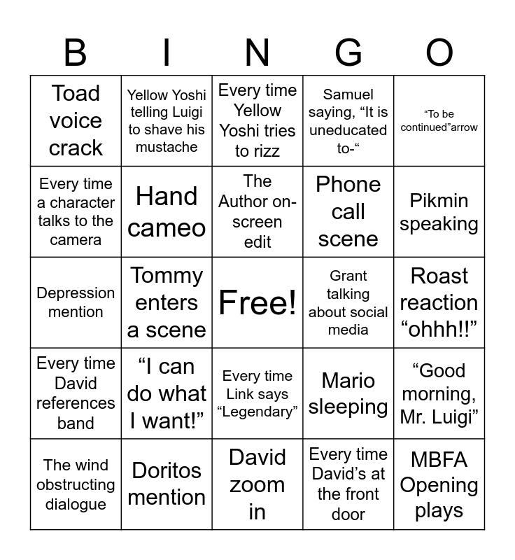 This bingo card has a free space and 24 words: “I can do what I want!”, Doritos mention, The Author on-screen edit, The wind obstructing dialogue, “To be continued”arrow, Toad voice crack, Every time a character talks to the camera, Yellow Yoshi telling Luigi to shave his mustache, Grant talking about social media, Every time Link says “Legendary”, Phone call scene, Depression mention, Mario sleeping, “Good morning, Mr. Luigi”, Hand cameo, Every time David’s at the front door, Roast reaction “ohhh!!”, Every time Yellow Yoshi tries to rizz, Pikmin speaking, Tommy enters a scene, MBFA Opening plays, Every time David references band, Samuel saying, “It is uneducated to-“ and David zoom in.