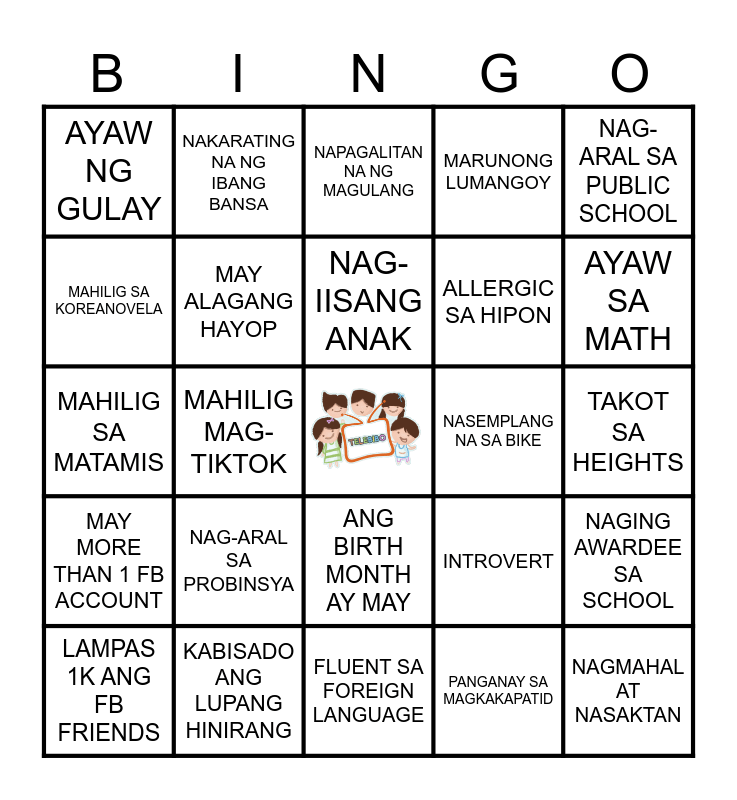 This bingo card has a free space and 24 words: NAG-ARAL SA PROBINSYA, KABISADO ANG LUPANG HINIRANG, NAG-IISANG ANAK, LAMPAS 1K ANG FB FRIENDS, NAG-ARAL SA PUBLIC SCHOOL, AYAW NG GULAY, MAHILIG SA KOREANOVELA, NAKARATING NA NG IBANG BANSA, NASEMPLANG NA SA BIKE, ANG BIRTH MONTH AY MAY, ALLERGIC SA HIPON, MAHILIG SA MATAMIS, INTROVERT, NAGING AWARDEE SA SCHOOL, MAY ALAGANG HAYOP, PANGANAY SA MAGKAKAPATID, TAKOT SA HEIGHTS, NAPAGALITAN NA NG MAGULANG, AYAW SA MATH, MAHILIG MAG-TIKTOK, NAGMAHAL AT NASAKTAN, MAY MORE THAN 1 FB ACCOUNT, MARUNONG LUMANGOY and FLUENT SA FOREIGN LANGUAGE.