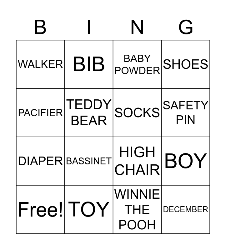 This bingo card has a free space and 15 words: Free!, DECEMBER, BABY POWDER, WALKER, SAFETY PIN, PACIFIER, BASSINET, WINNIE THE POOH, TEDDY BEAR, DIAPER, BOY, SHOES, SOCKS, BIB and TOY.