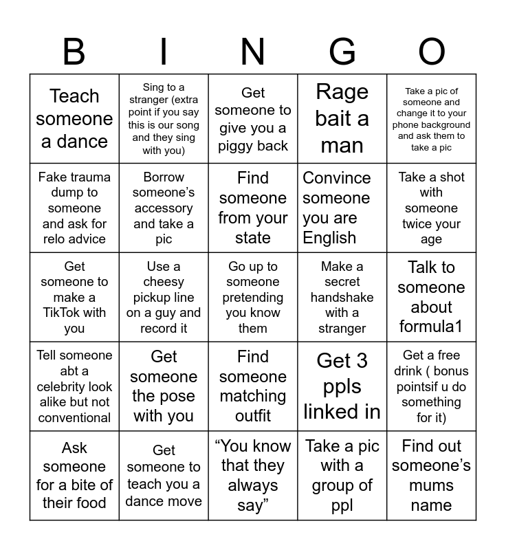 This bingo card has 25 words: Get someone the pose with you, “You know that they always say”, Find someone from your state, Ask someone for a bite of their food, Take a pic of someone and change it to your phone background and ask them to take a pic, Teach someone a dance, Fake trauma dump to someone and ask for relo advice, Sing to a stranger (extra point if you say this is our song and they sing with you), Make a secret handshake with a stranger, Find someone matching outfit, Convince someone you are English, Get someone to make a TikTok with you, Get 3 ppls linked in, Get a free drink ( bonus pointsif u do something for it), Borrow someone’s accessory and take a pic, Find out someone’s mums name, Talk to someone about formula1, Get someone to give you a piggy back, Take a shot with someone twice your age, Use a cheesy pickup line on a guy and record it, Go up to someone pretending you know them, Get someone to teach you a dance move, Tell someone abt a celebrity look alike but not conventional, Rage bait a man and Take a pic with a group of ppl.