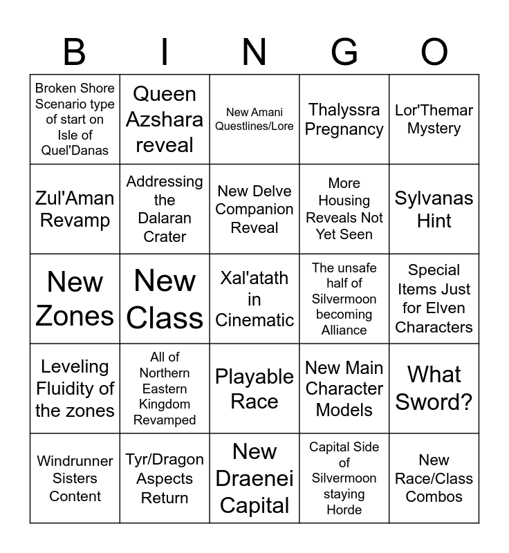 This bingo card has a free space and 24 words: All of Northern Eastern Kingdom Revamped, Tyr/Dragon Aspects Return, New Delve Companion Reveal, Windrunner Sisters Content, Lor'Themar Mystery, Broken Shore Scenario type of start on Isle of Quel'Danas, Zul'Aman Revamp, Queen Azshara reveal, The unsafe half of Silvermoon becoming Alliance, Playable Race, More Housing Reveals Not Yet Seen, New Zones, New Main Character Models, What Sword?, Addressing the Dalaran Crater, Capital Side of Silvermoon staying Horde, Special Items Just for Elven Characters, New Amani Questlines/Lore, Sylvanas Hint, New Class, New Race/Class Combos, Leveling Fluidity of the zones, Thalyssra Pregnancy and New Draenei Capital.