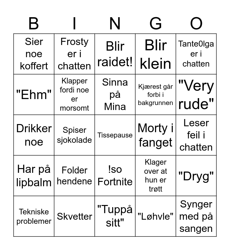 This bingo card has 36 words: Streamer i feil kategori, Kjærest som sier/gjør noe rart, Gjesper, Klapper fordi noe er morsomt, Klager over at hun er trøtt, Har på lipbalm, Sinna på Mina, Skrur av musikken ved et uhell, Tante0lga er i chatten, Sinna på Nicolai, Spiser sjokolade, Blir klein, Free!, Morty i fanget, "Very rude", Sier noe koffert, Synger med på sangen, Folder hendene, Tissepause, Blir raidet!, Leser feil i chatten, "Dryg", Skvetter, Tekniske problemer, "Tuppå sitt", Frosty er i chatten, Drikker noe, Mute ved uhell, Kjærest går forbi i bakgrunnen, "Ehm", Glemmer å bytte scene, Noen blir banna, "Løhvle", !so Fortnite, Bruker nesespray and Charlie bjeffer.