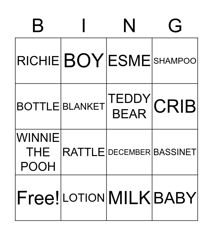 This bingo card has a free space and 15 words: Free!, BABY, ESME, RICHIE, CRIB, BOTTLE, RATTLE, MILK, BLANKET, WINNIE THE POOH, BASSINET, SHAMPOO, TEDDY BEAR, BOY and LOTION.