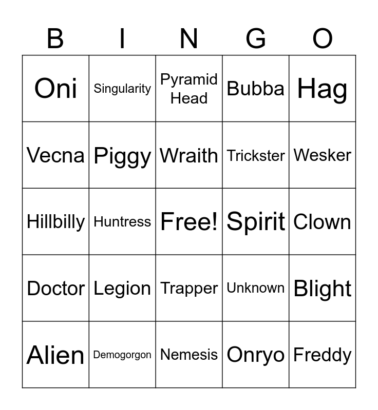 This bingo card has a free space and 41 words: Myers, Hillbilly, Ghostface, Piggy, Demogorgon, Trapper, Wraith, Nurse, Hag, Doctor, Huntress, Bubba, Freddy, Clown, Spirit, Legion, Plague, Oni, Deathslinger, Pyramid Head, Blight, Twins, Nemesis, Trickster, Cenobite, Artist, Onryo, Dredge, Wesker, Knight, Skull Merchant, Singularity, Alien, Chucky, Unknown, Vecna, Dracula, Houndmaster, Ghoul, Springtrap and Krasue.