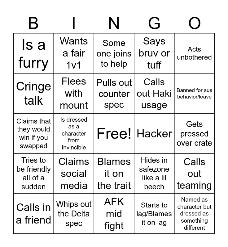 This bingo card has a free space and 24 words: Claims social media, Whips out the Delta spec, Pulls out counter spec, Calls in a friend, Acts unbothered, Is a furry, Cringe talk, Wants a fair 1v1, Hacker, Blames it on the trait, Calls out Haki usage, Claims that they would win if you swapped, Hides in safezone like a lil beech, Calls out teaming, Flees with mount, Starts to lag/Blames it on lag, Gets pressed over crate, Some one joins to help, Banned for sus behavior/leave, Is dressed as a character from Invincible, Named as character but dressed as something different, Tries to be friendly all of a sudden, Says bruv or tuff and AFK mid fight.