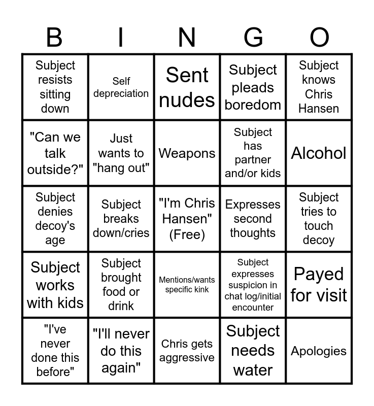 This bingo card has a free space and 29 words: "I've never done this before", Condoms, Subject breaks down/cries, "My life is over", Subject resists sitting down, Sent nudes, Just wants to "hang out", Subject brought food or drink, Expresses second thoughts, "I'll never do this again", Subject tries to touch decoy, Apologies, Chris gets aggressive, Subject needs water, Alcohol, Drove 45 minutes or more, Mentions/wants specific kink, Subject works with kids, Subject knows Chris Hansen, Subject denies decoy's age, Subject expresses suspicion in chat log/initial encounter, Subject wants to turn off camera, Subject has partner and/or kids, "Can we talk outside?", Subject pleads boredom, Self depreciation, Payed for visit, Weapons and Subject tries to leave early.