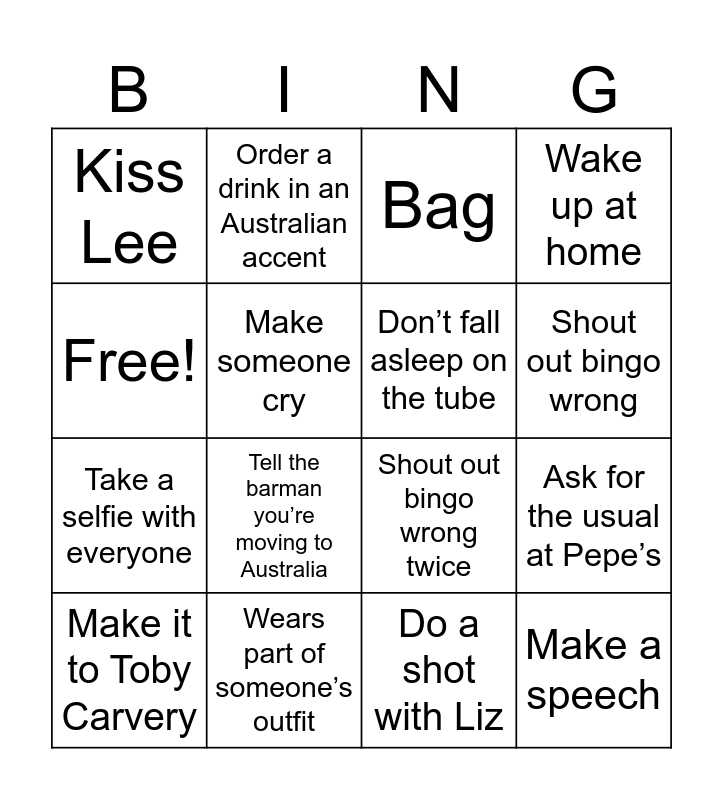 This bingo card has 16 words: Wears part of someone’s outfit, Ask for the usual at Pepe’s, Bag, Kiss Lee, Take a selfie with everyone, Order a drink in an Australian accent, Shout out bingo wrong twice, Do a shot with Liz, Free!, Make someone cry, Make it to Toby Carvery, Wake up at home, Tell the barman you’re moving to Australia, Shout out bingo wrong, Don’t fall asleep on the tube and Make a speech.