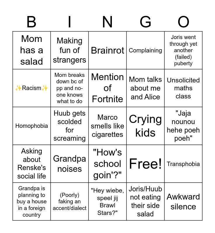 This bingo card has 25 words: Grandpa noises, "Hey wiebe, speel jij Brawl Stars?", Mention of Fortnite, Grandpa is planning to buy a house in a foreign country, Joris went through yet another (failed) puberty, Mom has a salad, ✨Racism✨, Making fun of strangers, Crying kids, "How's school goin'?", Mom talks about me and Alice, Homophobia, Free!, Transphobia, Mom breaks down bc of pp and no-one knows what to do, Awkward silence, "Jaja nounou hehe poeh poeh", Brainrot, Unsolicited maths class, Huub gets scolded for screaming, Marco smells like cigarettes, (Poorly) faking an accent/dialect, Asking about Renske's social life, Complaining and Joris/Huub not eating their side salad.