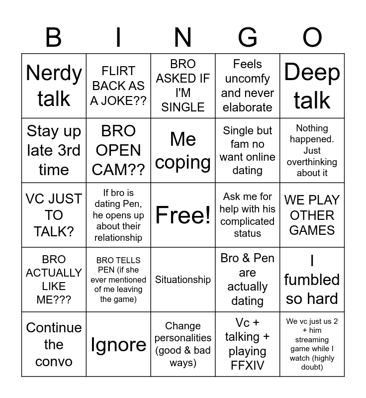 This bingo card has a free space and 24 words: BRO TELLS PEN (if she ever mentioned of me leaving the game), Ignore, Me coping, Continue the convo, Deep talk, Nerdy talk, Stay up late 3rd time, FLIRT BACK AS A JOKE??, Ask me for help with his complicated status, Situationship, Single but fam no want online dating, VC JUST TO TALK?, Bro & Pen are actually dating, I fumbled so hard, BRO OPEN CAM??, Vc + talking + playing FFXIV, WE PLAY OTHER GAMES, BRO ASKED IF I'M SINGLE, Nothing happened. Just overthinking about it, If bro is dating Pen, he opens up about their relationship, We vc just us 2 + him streaming game while I watch (highly doubt), BRO ACTUALLY LIKE ME???, Feels uncomfy and never elaborate and Change personalities (good & bad ways).