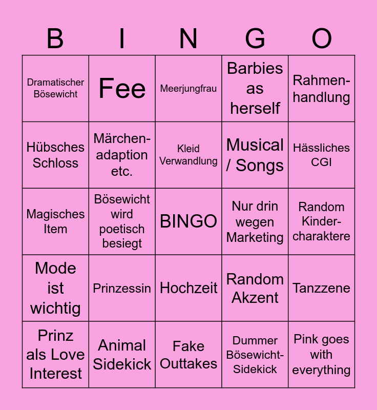 This bingo card has a free space and 24 words: Prinzessin, Animal Sidekick, Kleid Verwandlung, Prinz als Love Interest, Rahmen- handlung, Dramatischer Bösewicht, Hübsches Schloss, Fee, Nur drin wegen Marketing, Hochzeit, Musical / Songs, Magisches Item, Random Akzent, Tanzzene, Märchen- adaption etc., Dummer Bösewicht- Sidekick, Random Kinder- charaktere, Meerjungfrau, Hässliches CGI, Bösewicht wird poetisch besiegt, Pink goes with everything, Mode ist wichtig, Barbies as herself and Fake Outtakes.