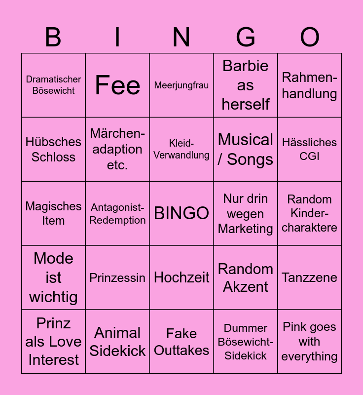 This bingo card has a free space and 24 words: Prinzessin, Animal Sidekick, Kleid-Verwandlung, Prinz als Love Interest, Rahmen- handlung, Dramatischer Bösewicht, Hübsches Schloss, Fee, Nur drin wegen Marketing, Hochzeit, Musical / Songs, Magisches Item, Random Akzent, Tanzzene, Märchen- adaption etc., Dummer Bösewicht- Sidekick, Random Kinder- charaktere, Meerjungfrau, Hässliches CGI, Antagonist- Redemption, Pink goes with everything, Mode ist wichtig, Barbie as herself and Fake Outtakes.