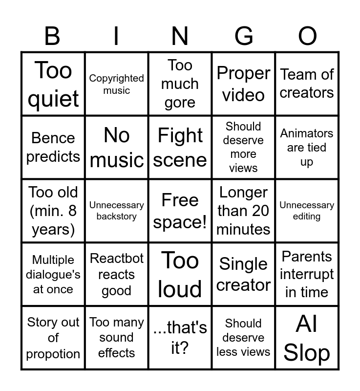 This bingo card has a free space and 28 words: Parents interrupt in time, Bot comments, Should deserve more views, Should deserve less views, Bence predicts, Too much gore, Copyrighted music, Multiple dialogue's at once, Longer than 20 minutes, Story out of propotion, Too old (min. 8 years), Proper video, Too many sound effects, ...that's it?, Animators are tied up, No dialogue, Reactbot reacts good, No music, Fight scene, Too loud, Too quiet, Too dark, AI Slop, Unnecessary backstory, Unnecessary editing, Single creator, Team of creators and No editing.