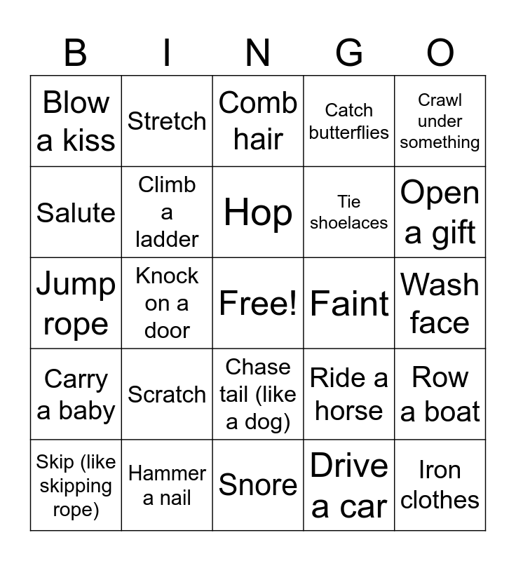 This bingo card has a free space and 25 words: Scratch, Snore, Hop, Skip (like skipping rope), Crawl under something, Blow a kiss, Salute, Stretch, Faint, Chase tail (like a dog), Tie shoelaces, Jump rope, Ride a horse, Row a boat, Climb a ladder, Shoot an arrow, Wash face, Comb hair, Open a gift, Knock on a door, Iron clothes, Hammer a nail, Carry a baby, Catch butterflies and Drive a car.