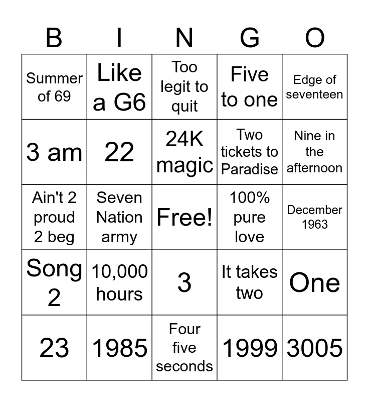 This bingo card has a free space and 32 words: 1999, 8 Mile, Seven Nation army, 99 bottles, Song 2, 22, Edge of seventeen, One, Like a G6, You're sixteen, 24K magic, Too legit to quit, 1 , 2 many, Land of 1000 dances, 100% pure love, 867-5309, 23, Ain't 2 proud 2 beg, 3, 10,000 hours, It takes two, Year 3000, December 1963, 1985, 3005, Five to one, Two tickets to Paradise, 3 am, Summer of 69, Four five seconds, I'm gonna be and Nine in the afternoon.
