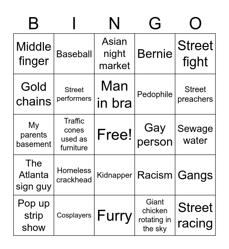 This bingo card has a free space and 25 words: Homeless crackhead, Furry, Man in bra, Pop up strip show, Street fight, Middle finger, Gold chains, Baseball, Gay person, Kidnapper, Pedophile, My parents basement, Racism, Gangs, Street performers, Unusual public art, Sewage water, Asian night market, Street preachers, Traffic cones used as furniture, Street racing, Cosplayers, The Atlanta sign guy, Bernie and Giant chicken rotating in the sky.