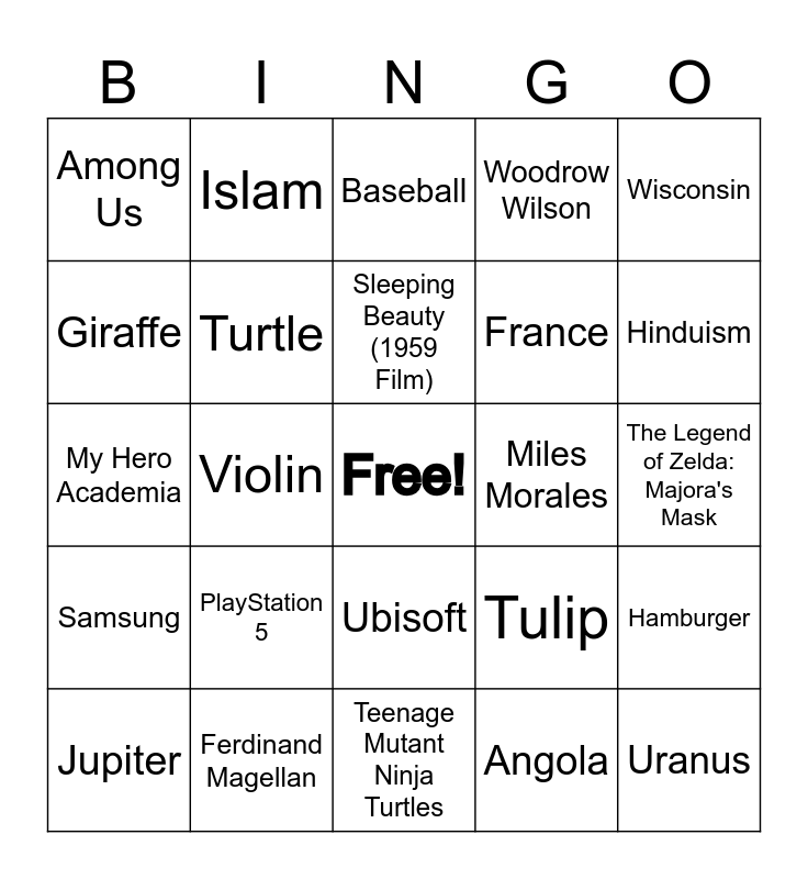 This bingo card has a free space and 24 words: PlayStation 5, Ferdinand Magellan, Sleeping Beauty (1959 Film), Jupiter, Wisconsin, Among Us, Giraffe, Islam, Miles Morales, Ubisoft, France, My Hero Academia, Tulip, Hamburger, Turtle, Angola, The Legend of Zelda: Majora's Mask, Baseball, Hinduism, Violin, Uranus, Samsung, Woodrow Wilson and Teenage Mutant Ninja Turtles.