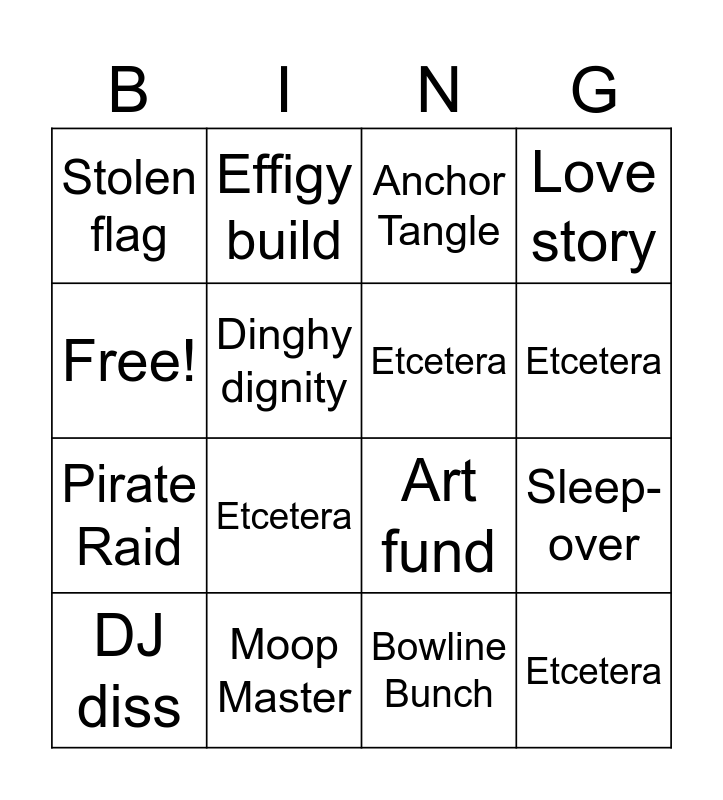 This bingo card has 16 words: Moop Master, Sleep-over, Anchor Tangle, Stolen flag, Pirate Raid, Effigy build, Art fund, Bowline Bunch, Free!, Dinghy dignity, DJ diss, Love story, Etcetera, Etcetera, Etcetera and Etcetera.