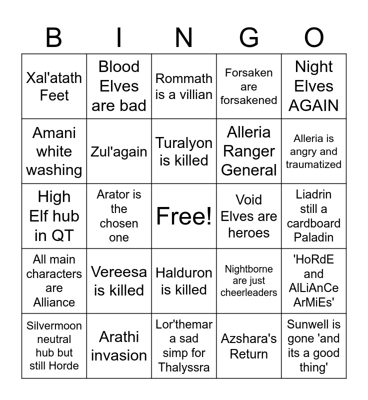 This bingo card has a free space and 24 words: Vereesa is killed, Arathi invasion, Turalyon is killed, Silvermoon neutral hub but still Horde, Night Elves AGAIN, Xal'atath Feet, Amani white washing, Blood Elves are bad, Void Elves are heroes, Halduron is killed, Alleria Ranger General, High Elf hub in QT, Nightborne are just cheerleaders, 'HoRdE and AlLiAnCe ArMiEs', Zul'again, Azshara's Return, Liadrin still a cardboard Paladin, Rommath is a villian, Alleria is angry and traumatized, Arator is the chosen one, Sunwell is gone 'and its a good thing', All main characters are Alliance, Forsaken are forsakened and Lor'themar a sad simp for Thalyssra.