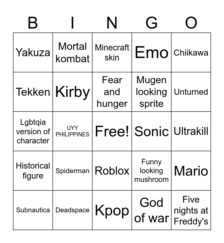 This bingo card has a free space and 24 words: Spiderman, Deadspace, Fear and hunger, Subnautica, Chiikawa, Yakuza, Tekken, Mortal kombat, Sonic, Roblox, Mugen looking sprite, Lgbtqia version of character, Funny looking mushroom, Mario, Kirby, God of war, Ultrakill, Minecraft skin, Unturned, UYY PHILIPPINES, Five nights at Freddy's, Historical figure, Emo and Kpop.
